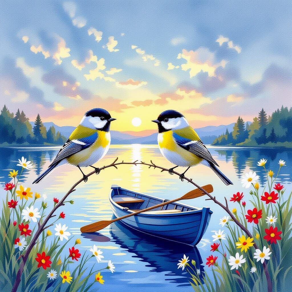 This image shows two goldcrest birds on a twig, with a serene lake, rowboat, and wildflowers. Rendered in a vibrant watercolor style with warm lighting.