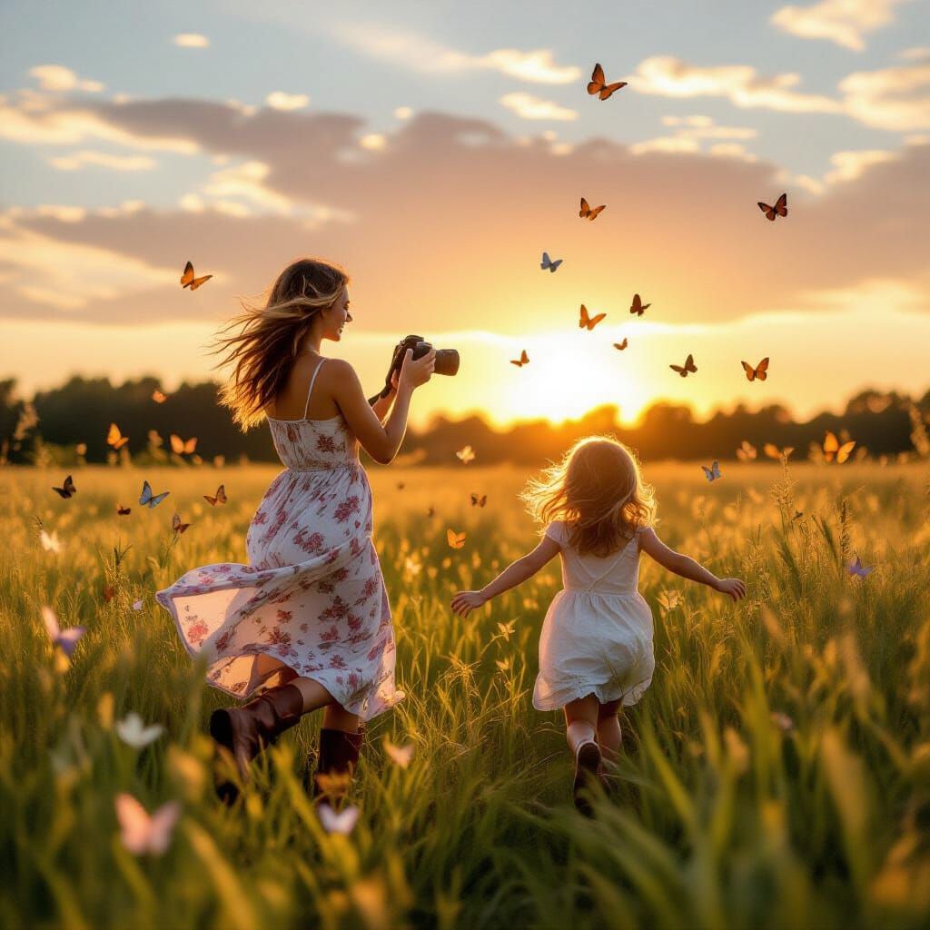 This image shows a woman photographing a girl running through a field of butterflies at sunset. The image is rendered with delicate textures and soft lighting, in a dreamy and whimsical style.