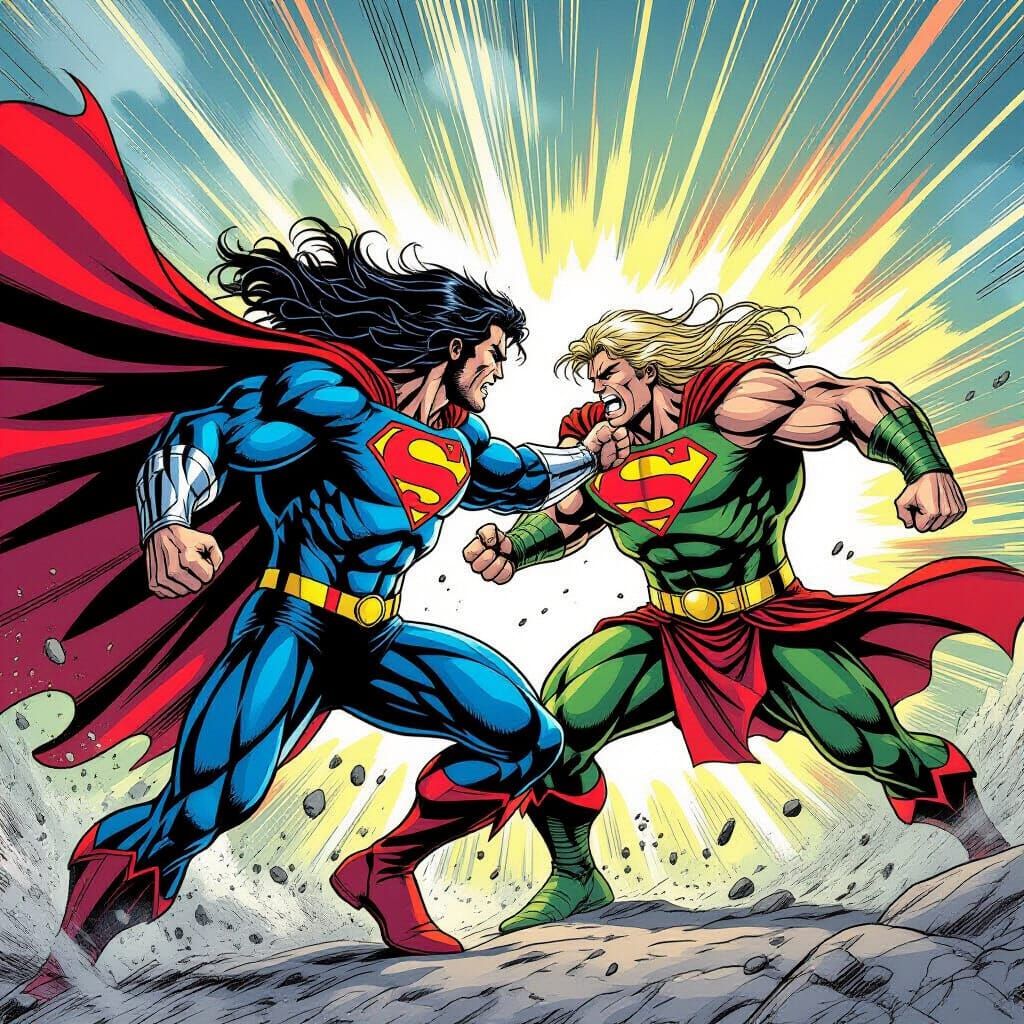 This image shows a dynamic comic book style battle between Achilles Superman with long black hair and Mongol. Features vibrant colors and energetic brushstrokes.