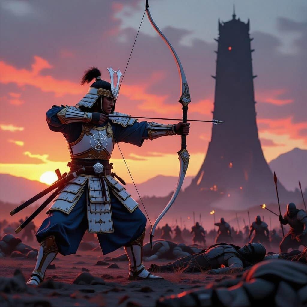A hyper-realistic image of an East Asian samurai warrior with white and gold armor, standing on a battlefield after a victory over orcs. Dramatic lighting highlights the scene under a red sunset.