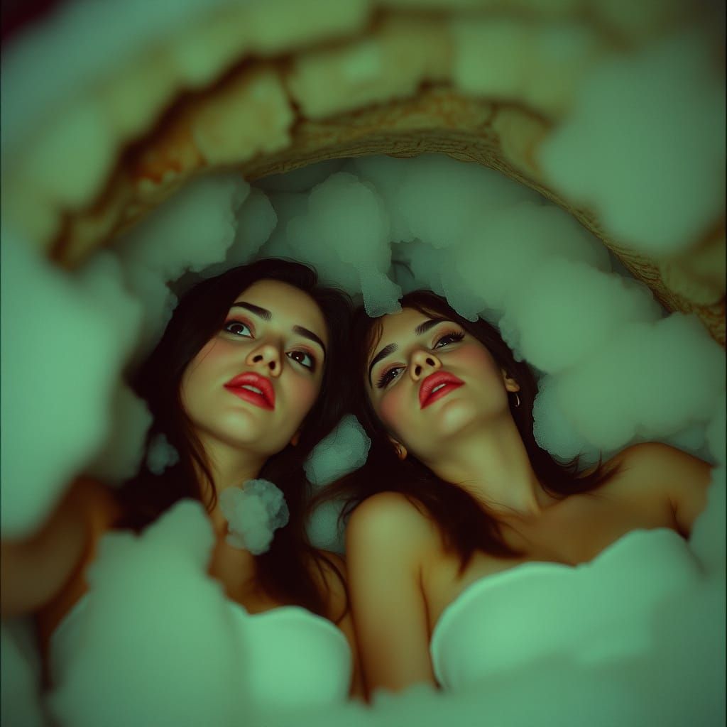 This image shows beautiful young women inside transparent soap bubbles. The picture is hyperrealistic with cinematic lighting, creating a dramatic and atmospheric scene.