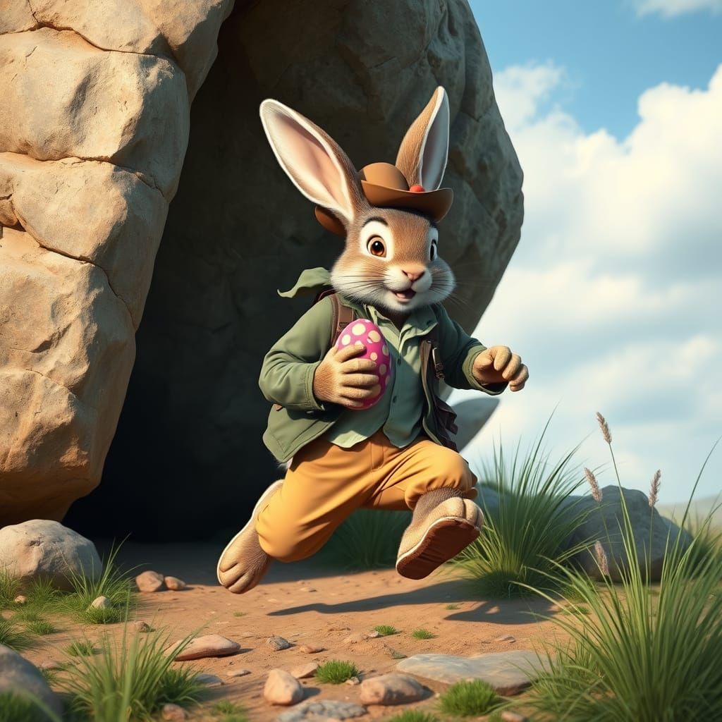 This image shows a frantic Easter bunny fleeing from a massive boulder while clutching a precious Easter egg. The bunny's explorer attire adds a thrilling twist to this whimsical scene.
