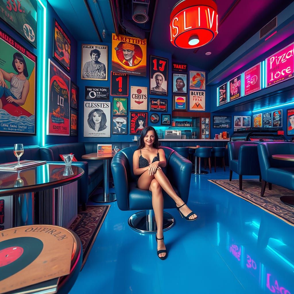 A vibrant nightclub interior featuring dark blue vintage furniture and walls adorned with posters. The scene includes a 24-hour ticket office and bar, all rendered in a futuristic, retro style.