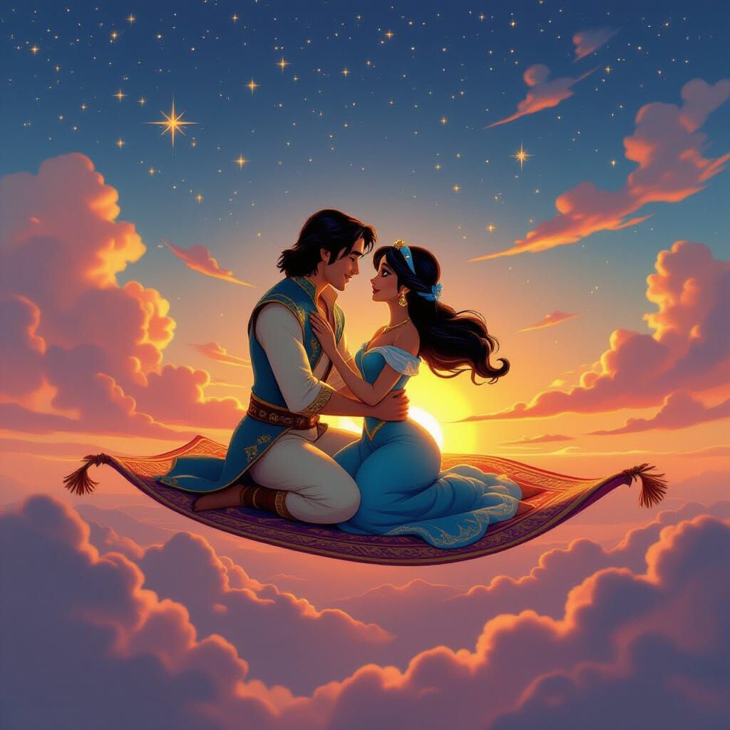 This image depicts Aladdin and Jasmine on a flying carpet during an enchanting oriental sunset. Rendered in a vibrant, romantic illustration style with glowing light and rich colors.