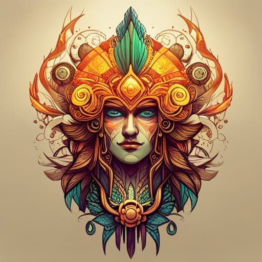 A vibrant digital painting of a cybernetic Atlantean Aztec warrior. The artwork features intricate details, luminous colors, golden outlines, and a shiny aura in a futuristic style.