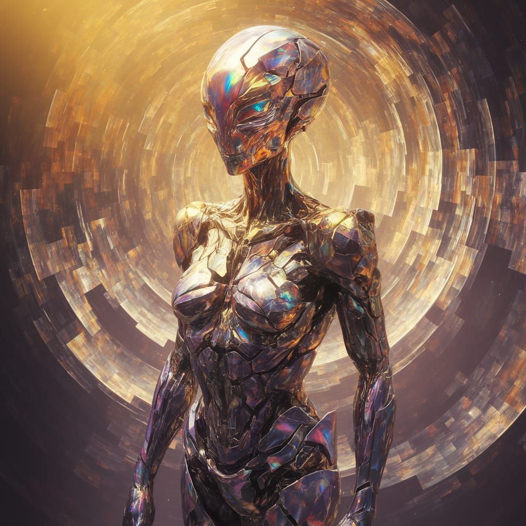 In a mesmerizing cubist artwork, fragmented geometric shapes form an alien creature with iridescent, shimmering hues of gold and violet. The background is a swirling mosaic of fractal patterns that blend seamlessly into the figure's disjointed anatomy, creating a sense of infinite complexity. Warm, golden ...
