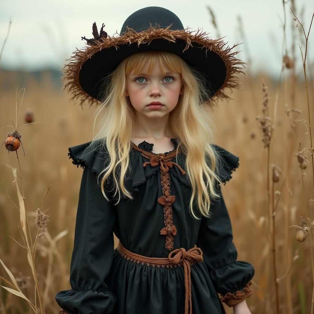 This image shows a blonde girl in tattered black scarecrow clothes standing in a rustic field. The whimsical folk art style emphasizes eerie elegance.