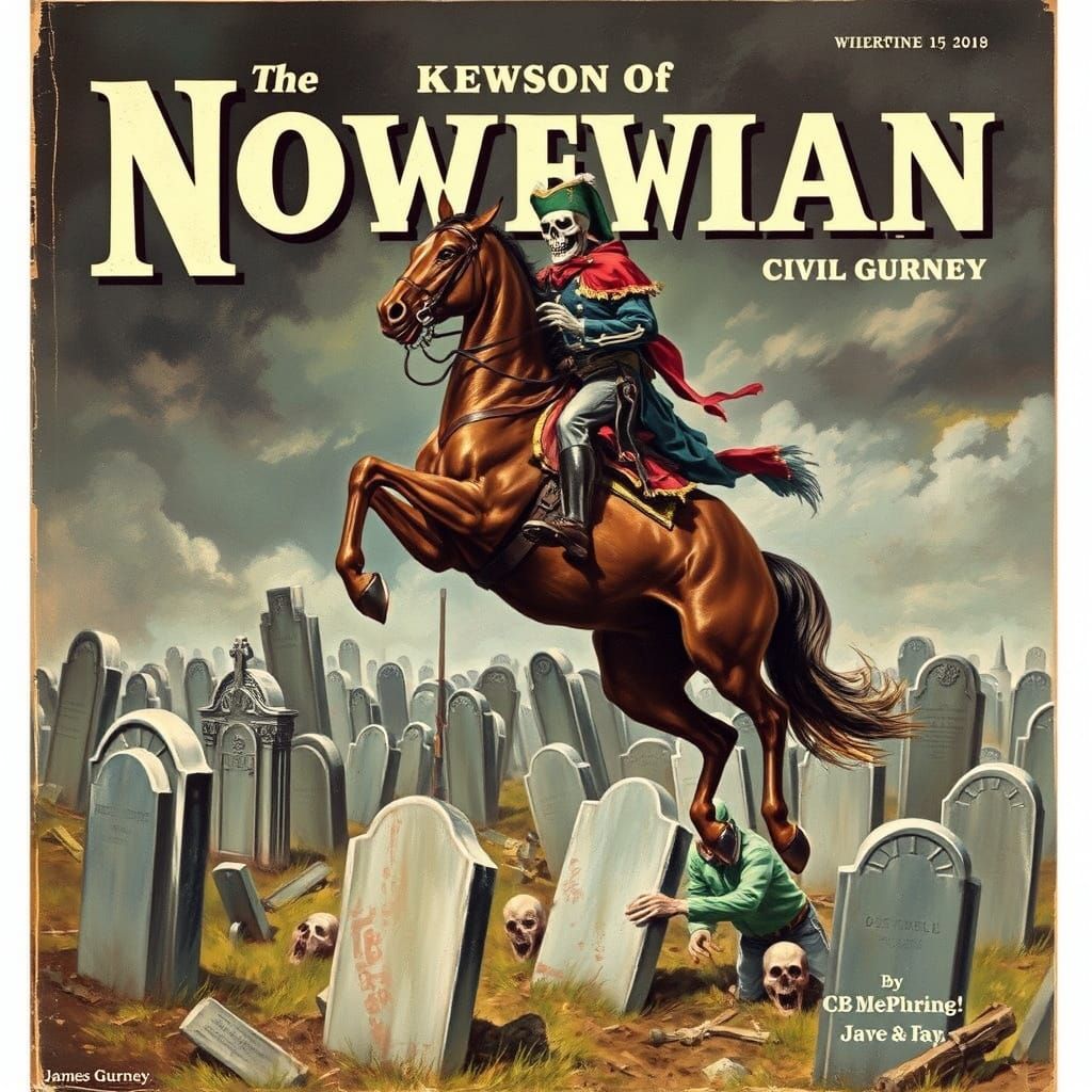 A vintage magazine cover featuring a skeletal Confederate general on horseback leaping over headstones. Grave diggers look on in horror in this oil painting.