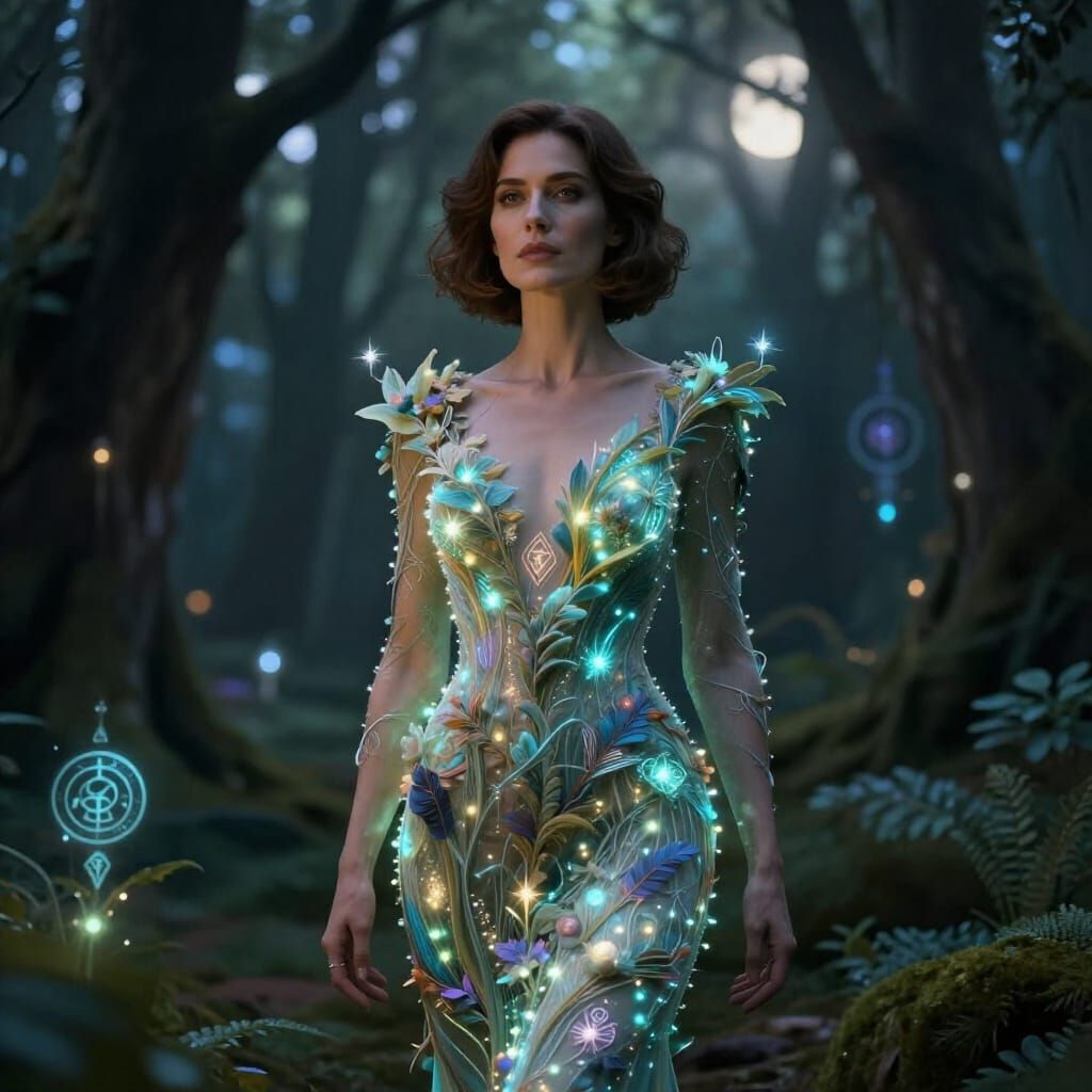 An elegant slim mature woman with bob cut brunette hair stands amidst a luminous enchanted forest, her gown intricately woven with bioluminescent flora. Delicate arcane symbols shimmer in the air around her, casting a soft glow on her serene face. The scene is bathed in the gentle light of unseen moons, ...