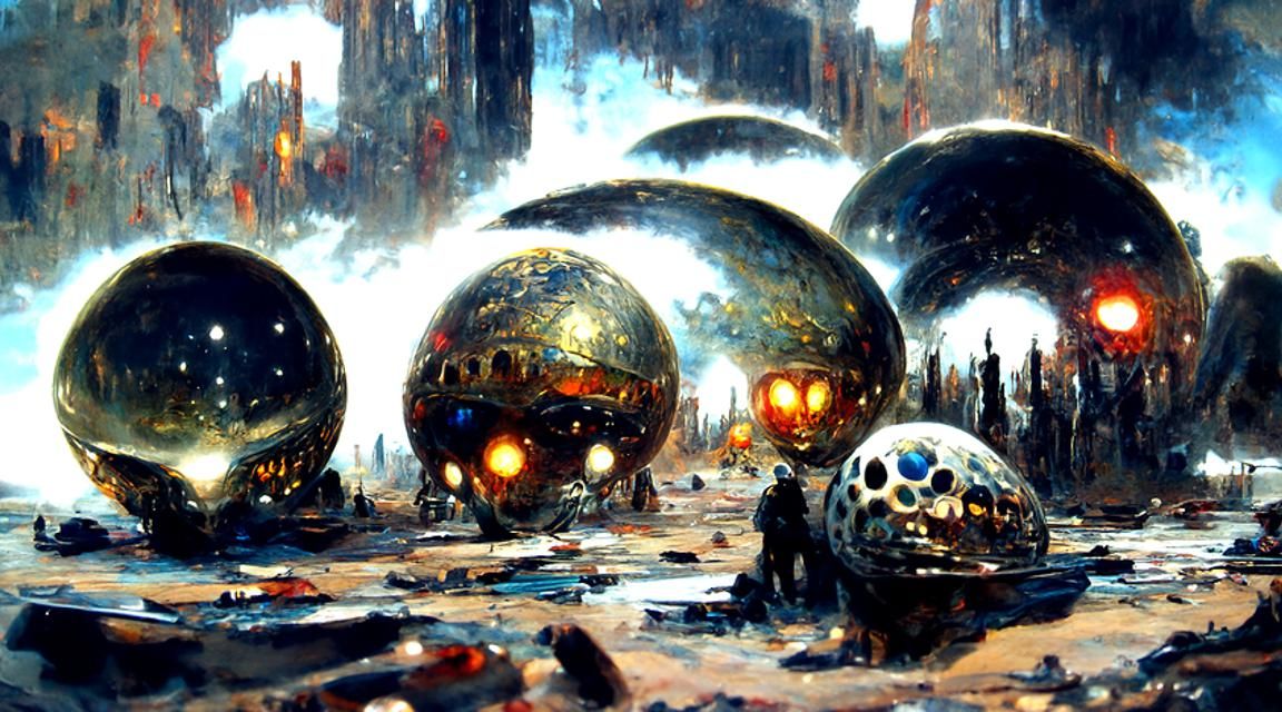 This image shows metallic orbs defending Earth from disc-shaped spacecraft amidst a post-apocalyptic landscape. It's a sci-fi scene with cosmic and dystopian elements in an ethereal, galactic setting.