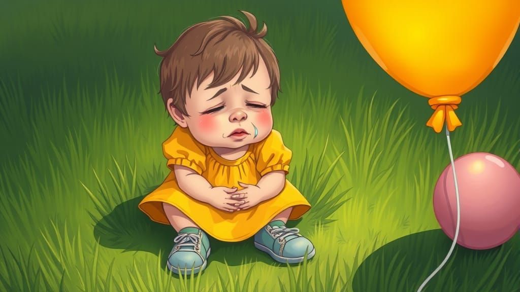 This image is a heartwarming, whimsical illustration of a young child sitting on a lush green lawn, surrounded by the remnants of a lost balloon. The child's sorrowful expression and the deflated balloon evoke a sense of melancholy, set against a backdrop of vibrant colors and intricate details reminisce...