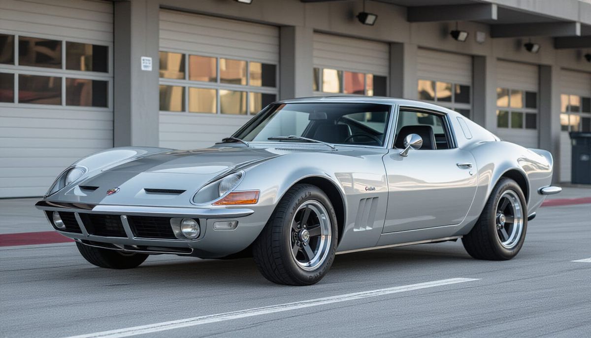 This image shows a retro-modern sports car with a wide, aggressive stance, reminiscent of the 1969 Opel GT. The car has a metallic silver finish, black alloy wheels, and minimal chrome, parked in a racetrack garage.