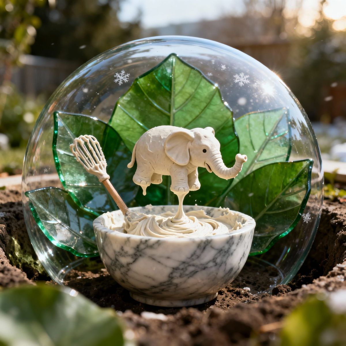 A photorealistic image shows an elephant formed from dough, emerging from a marble pot. The scene features a hemispherical pit lined with green glass leaves, captured in natural afternoon light with bokeh.