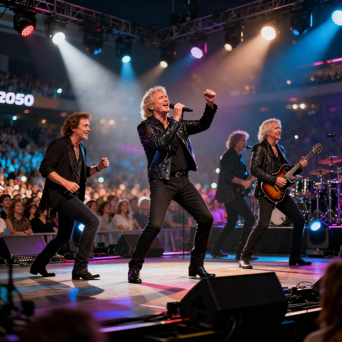 A photorealistic image capturing a vibrant 2050 reunion concert with dynamic stage lighting and a bokeh effect, presented in ultra-detailed, award-winning photography.