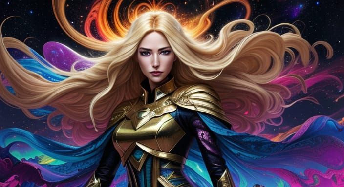 This image shows a dynamic medium shot of a blonde woman in vibrant comic book style. The digital painting features flowing fabric, metallic accents, psychedelic colors, and a dramatic cosmic landscape.