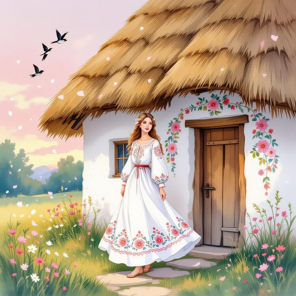 This image shows a woman in a traditional Ukrainian dress standing before a thatched-roof cottage. The scene is painted in watercolors, with a soft rose glow creating a dreamlike, poetic atmosphere reminiscent of a storybook.