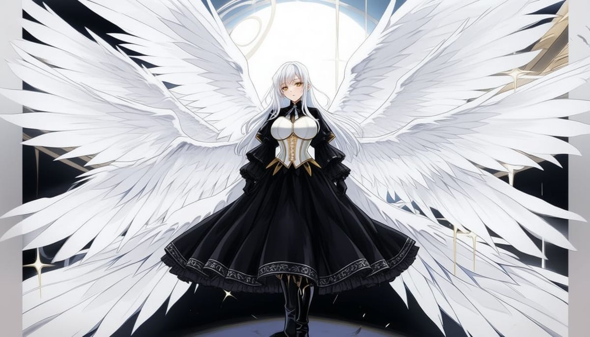 This image depicts an elegant angel named Gabriel with cascading white hair and striking gold eyes, standing before a luminous moon. She wears a gothic-inspired black dress adorned with frills and silver trim, complete with multiple pairs of white angel wings.