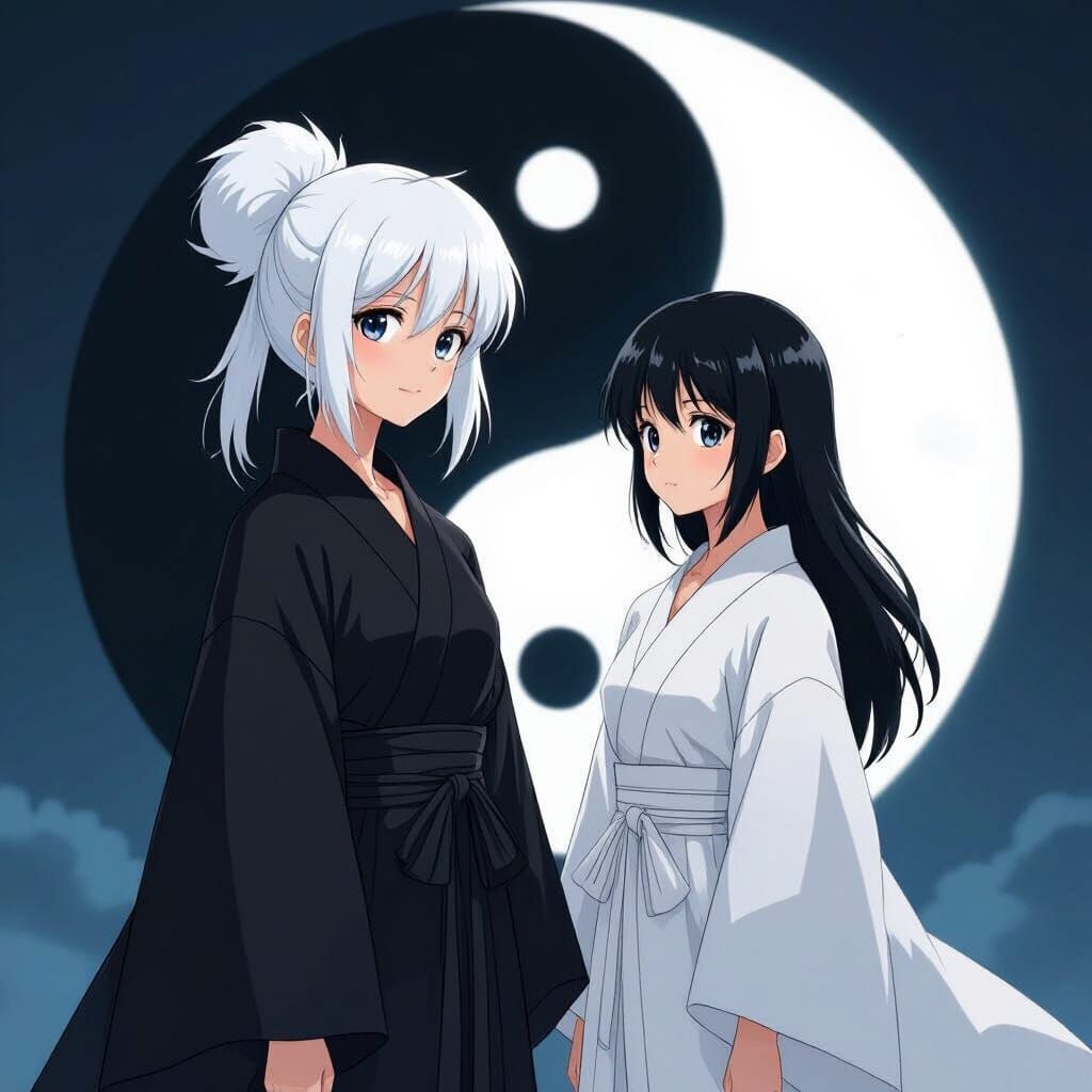 This image shows two anime-style teenage girls in contrasting robes, symbolizing yin and yang. The artwork evokes the style of Makoto Shinkai, with detailed backgrounds and character designs.