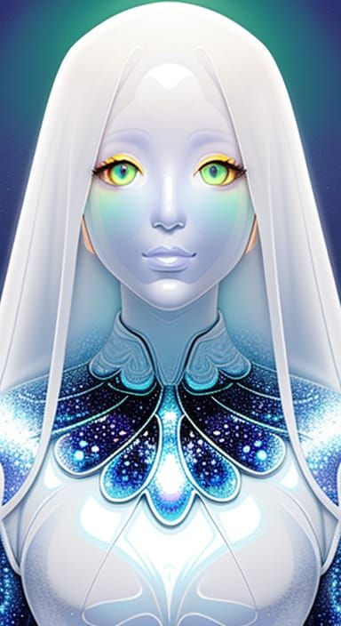 A striking portrait in line art of a woman's silhouette against a sunburst background. This image features translucent iridescent colors in a surreal pointillist style.