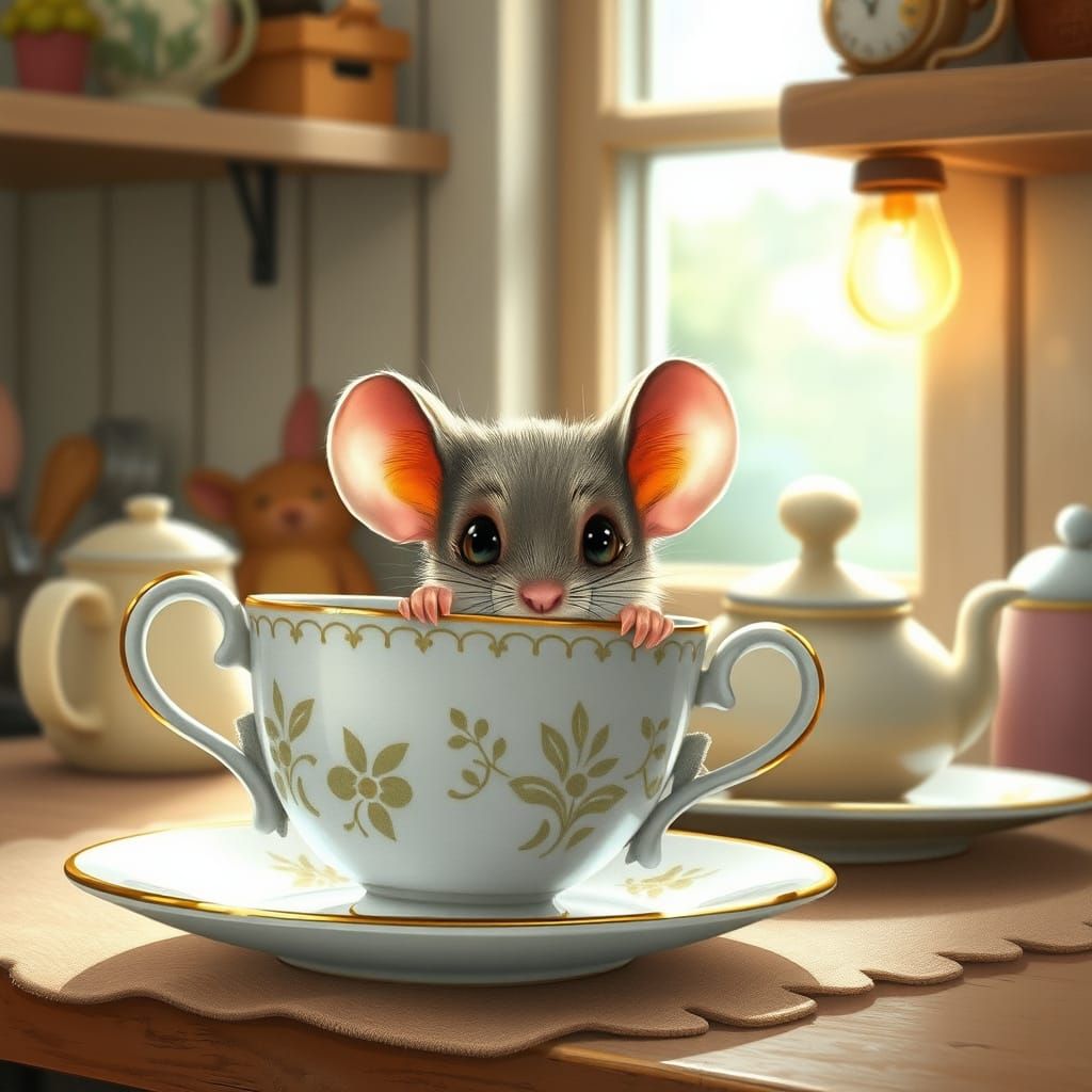 A charming illustration of a bashful mouse hiding behind a teacup. The cozy kitchen scene is bathed in soft morning light, rendered in warm pastel colors with ultra-detailed textures, in a whimsical storybook style.