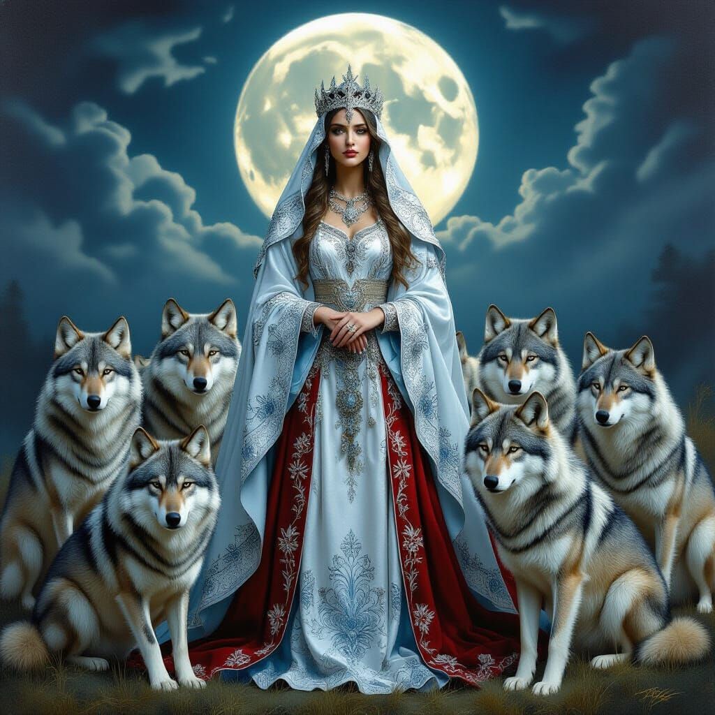 A striking picture of Boldogasszony, the Hungarian Moon Goddess, adorned in ornate robes. Majestic wolves surround her in this hyper-realistic composition, reminiscent of classic oil paintings.