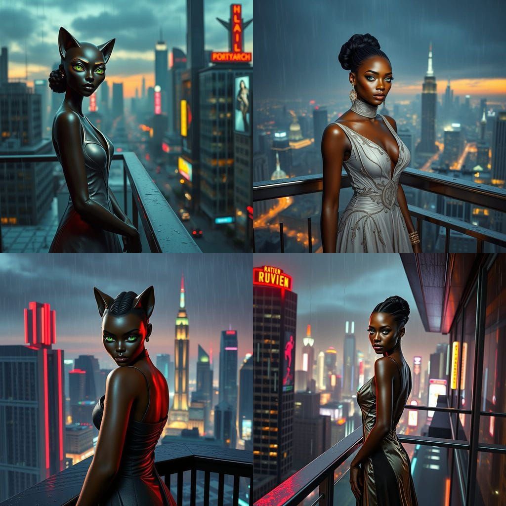 This image shows a striking head and shoulders portrait of an elegant woman with piercing green eyes, crafted from clay. She stands on a rain-slicked balcony overlooking a futuristic cityscape in a hyperrealistic, cinematic style with dramatic lighting.