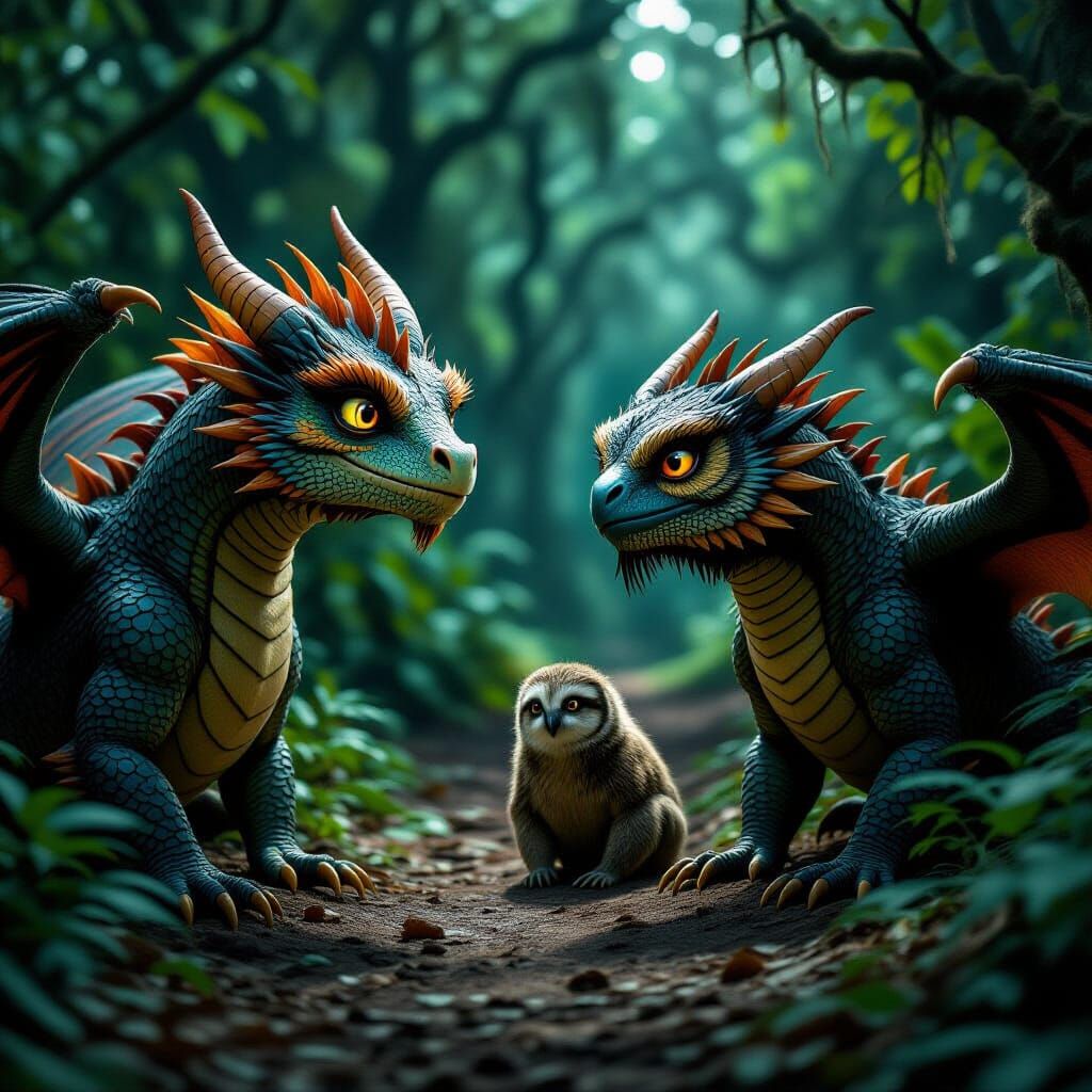 A cinematic still of a colorful female dragon, a male dragon, and a sloth traveling through a moody, dark forest path. Features atmospheric lighting and deep greens and browns.
