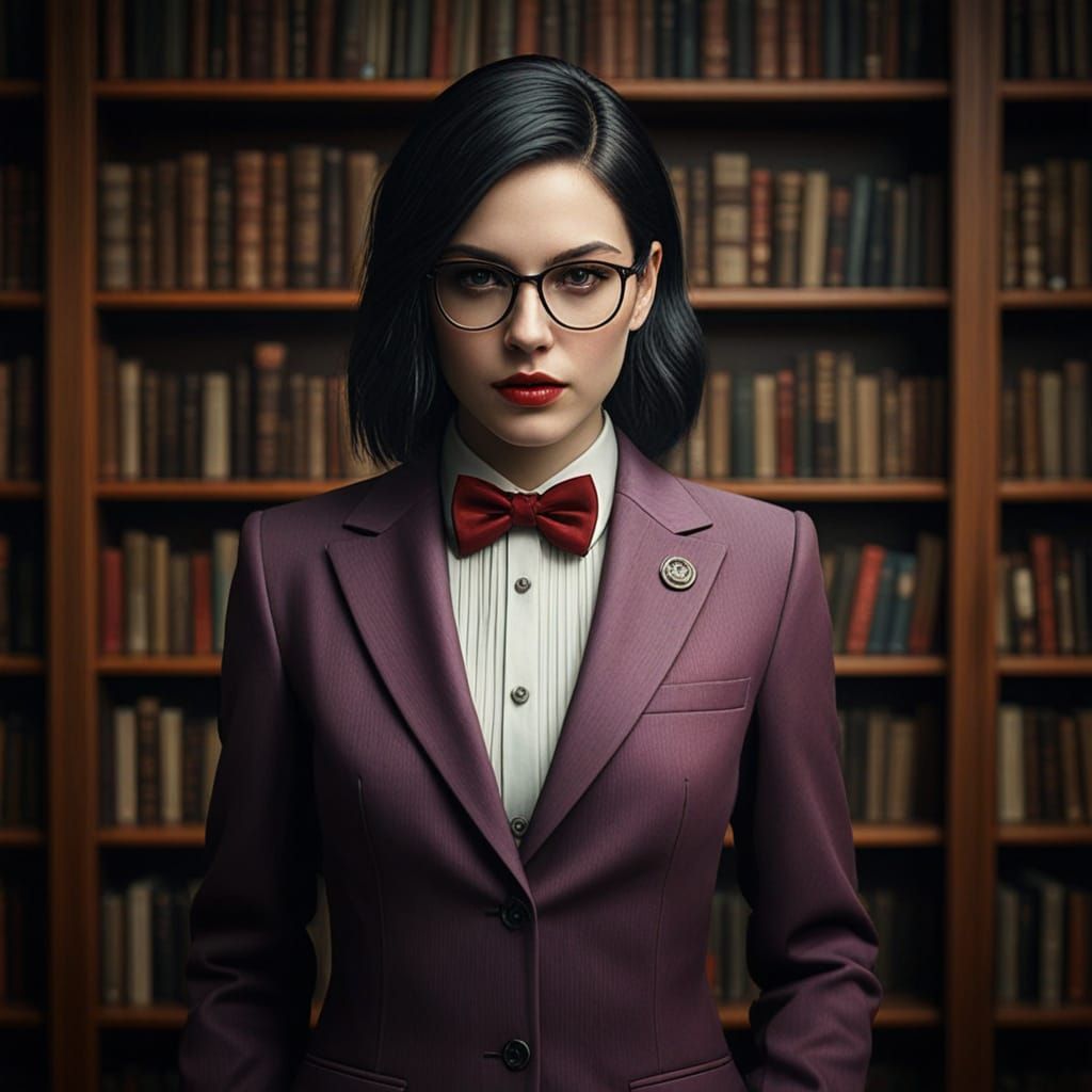 This image is a stunning, hyperrealistic portrait of a woman standing in a mystical old bookstore. Soft natural light illuminates her pale skin and dark hair, while her vampiric red eyes seem to hold secrets. The atmosphere is shrouded in mystery, with rich textiles and vibrant colors creating a sense of...
