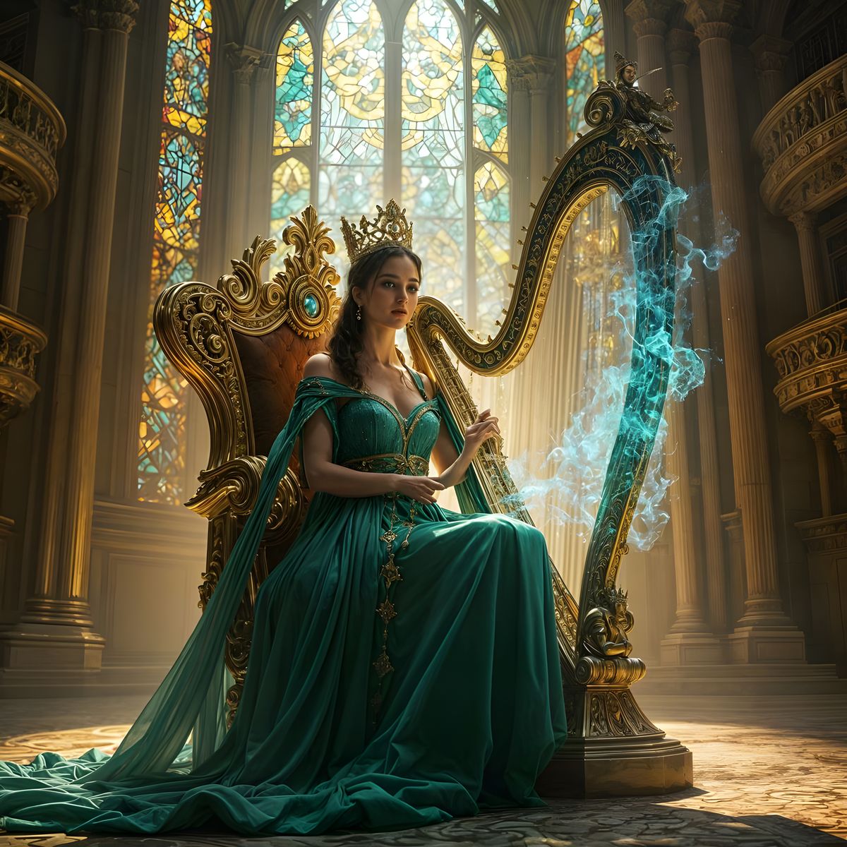 This image depicts a majestic queen playing a magical harp on a throne of musical notes in an opulent concert hall. The art style is hyperrealistic concept art with vibrant colors and intricate detail.