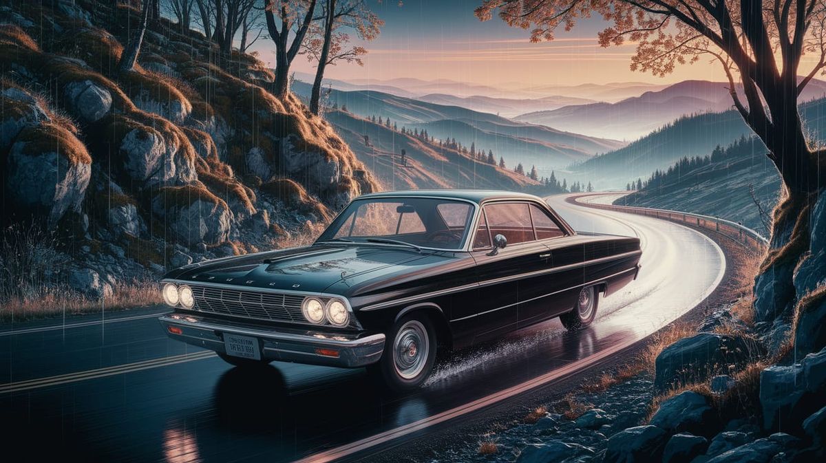 This image shows a black 1964 Ford Fairlane Thunderbolt driving on a winding, rainy mountain road. The digital painting features ethereal lighting and vibrant colors, creating a surreal atmosphere.