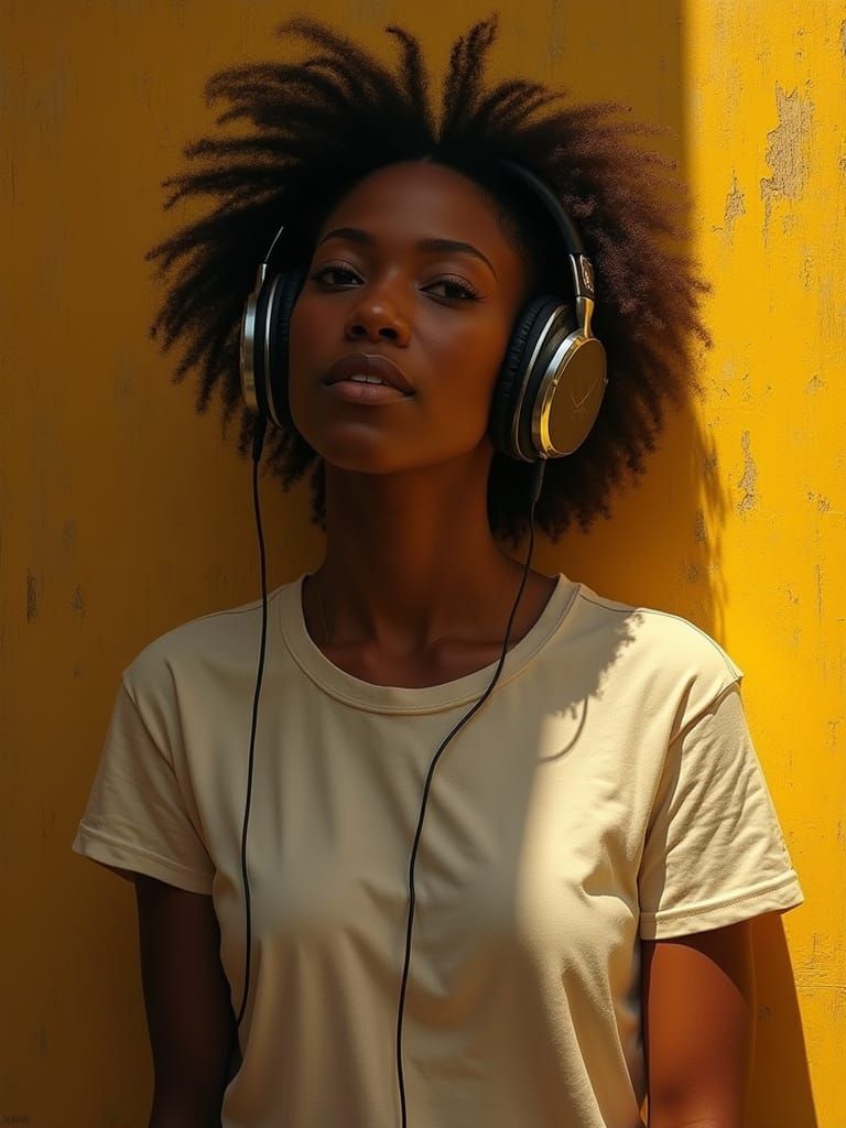 This image shows a modern African American female artist with headphones, depicted with the rich texture, golden light, and dramatic shadows of a 17th-century oil painting, featuring heavy impasto brushwork.