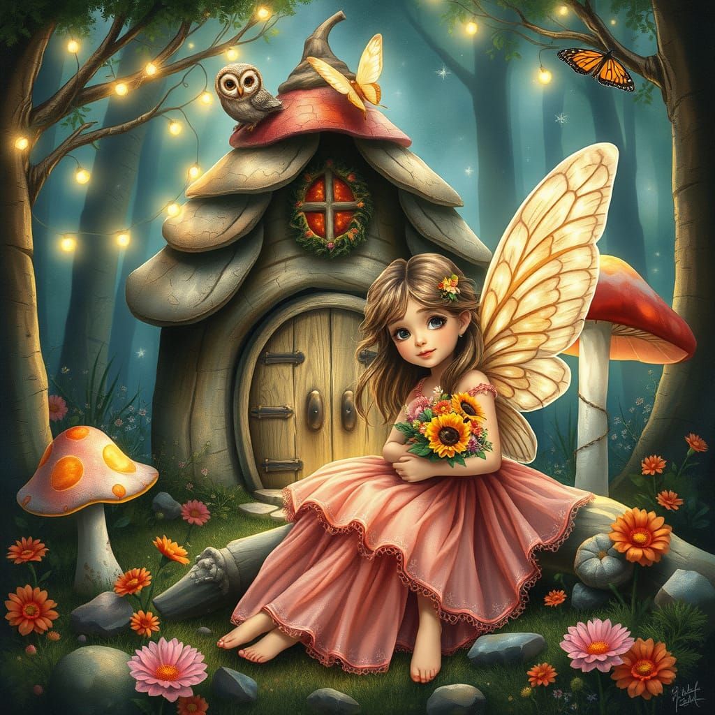 A charming image of a fairy girl with an owl beside a whimsical fairy house. She holds flowers in a magical forest setting, enhanced by refracted light and watercolor textures.