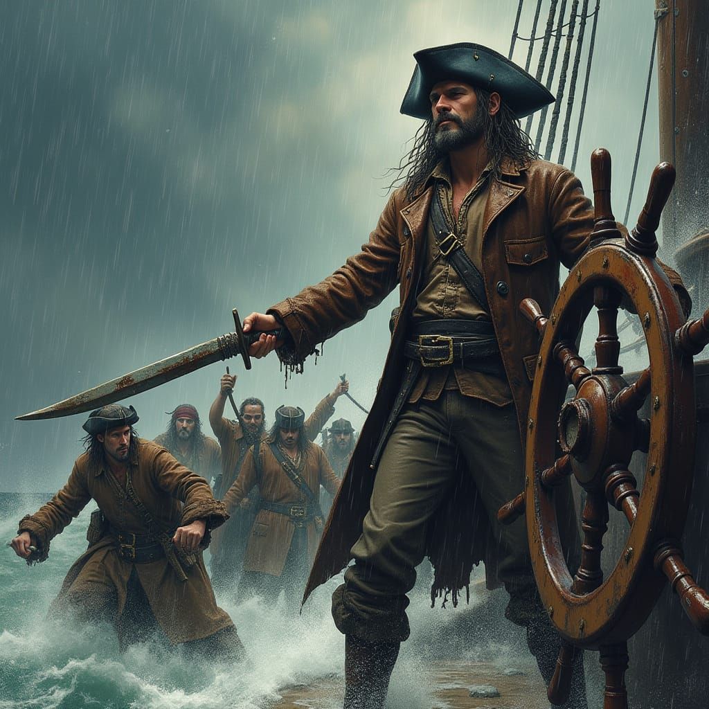 A dramatic image of a pirate captain standing at the helm of a ship, sword raised, as a fierce storm rages on with massive waves and torrential rain, in a style reminiscent of classic fantasy art with intricate textures and muted colors