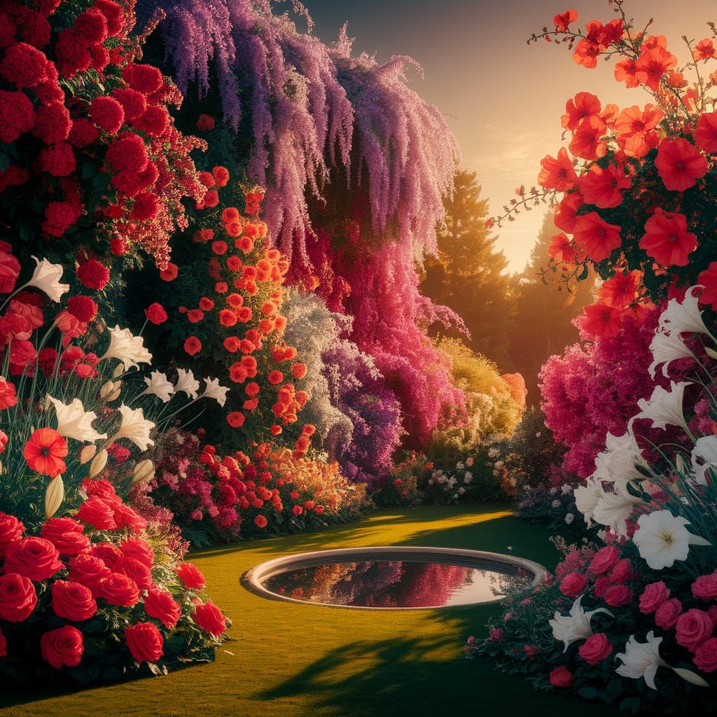 A picturesque flowerbed bursting with vibrant colors surrounds a tranquil pond. Sunlight illuminates the scene, highlighting the textures of roses, jasmine, poppies, and lilies in a cinematic style.