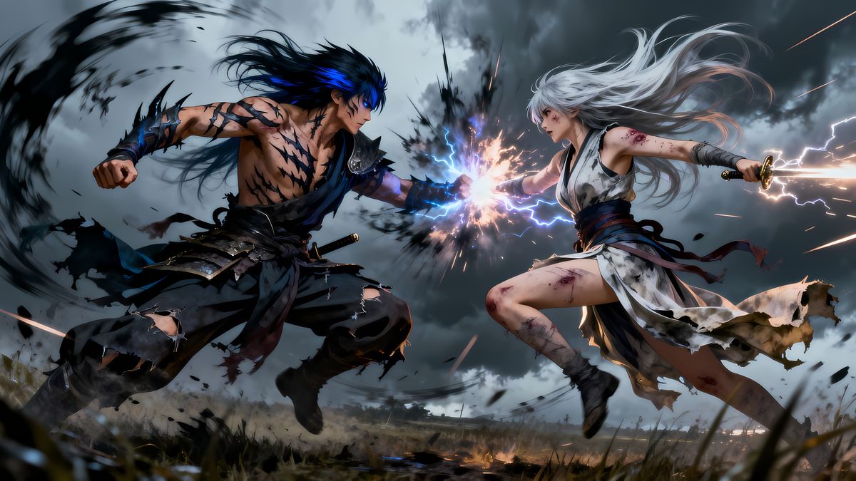 “Two battle-hardened warriors collide midair in a storm-shrouded, chaotic battlefield, radiating fierce, shadowed elemental energy. The mal...