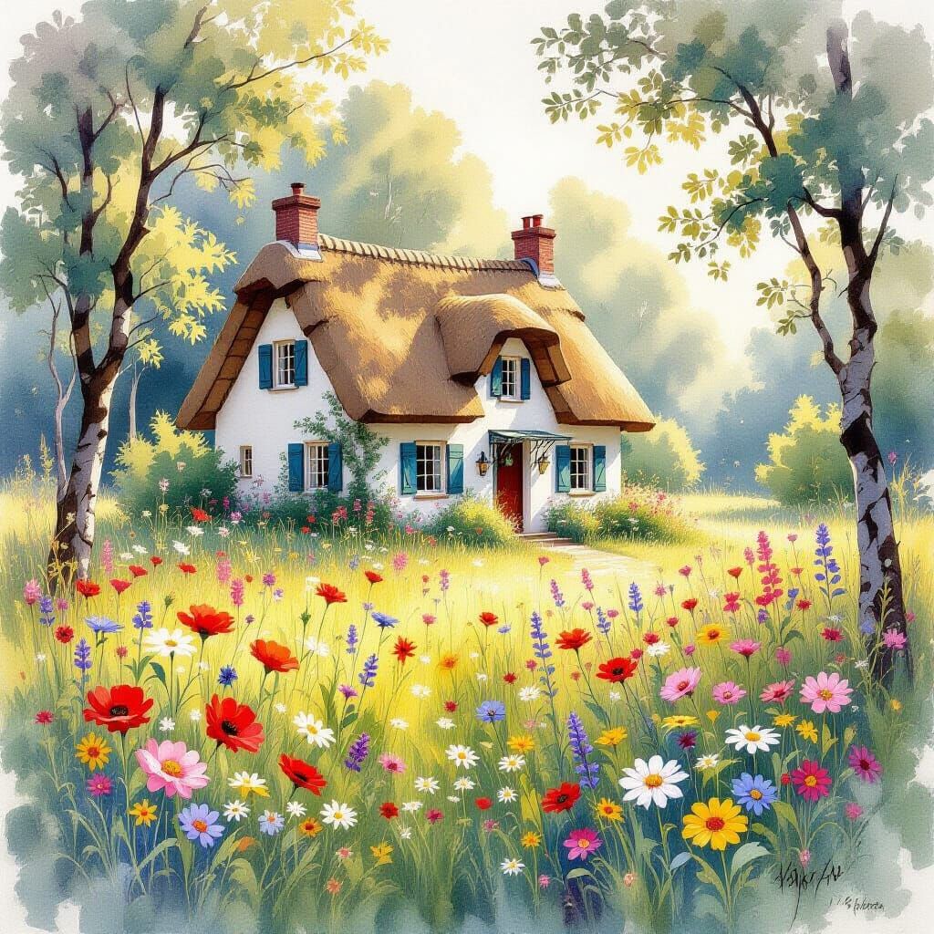 A watercolor and alcohol ink painting of a quaint cottage nestled in a wildflower meadow. The artwork features rococo filigree accents, shabby chic elements, and a dreamy, magical atmosphere.
