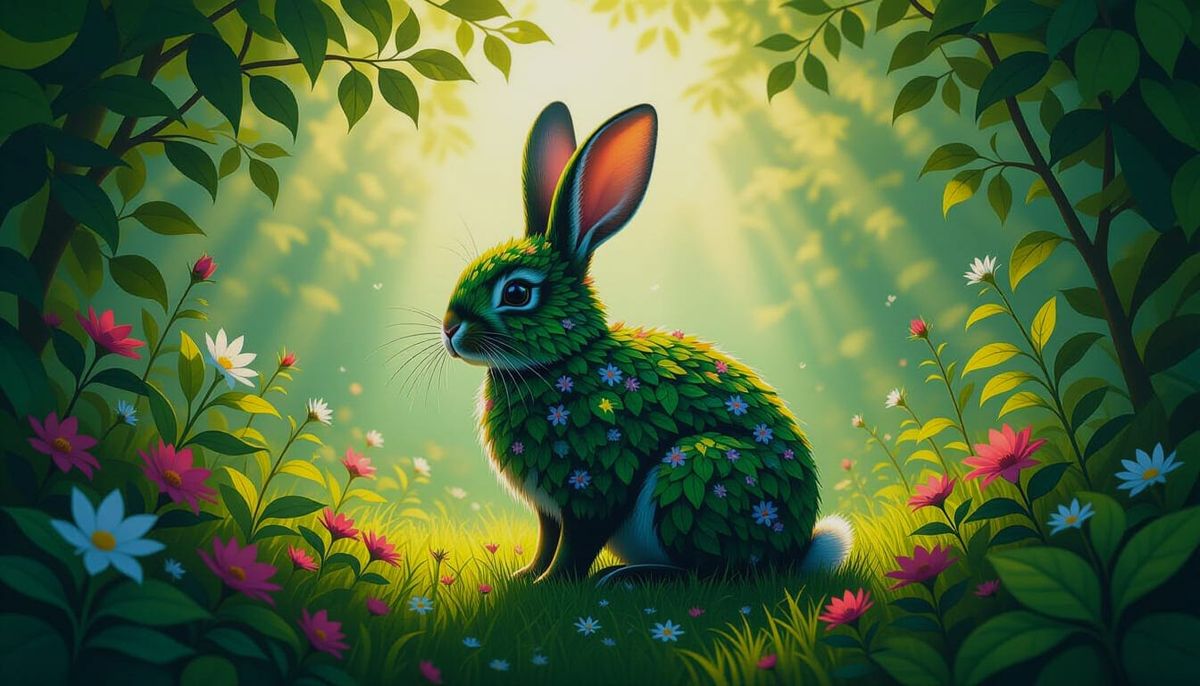 "Whimsical 3D double exposure silhouette rabbit garden surrealism oil painting"