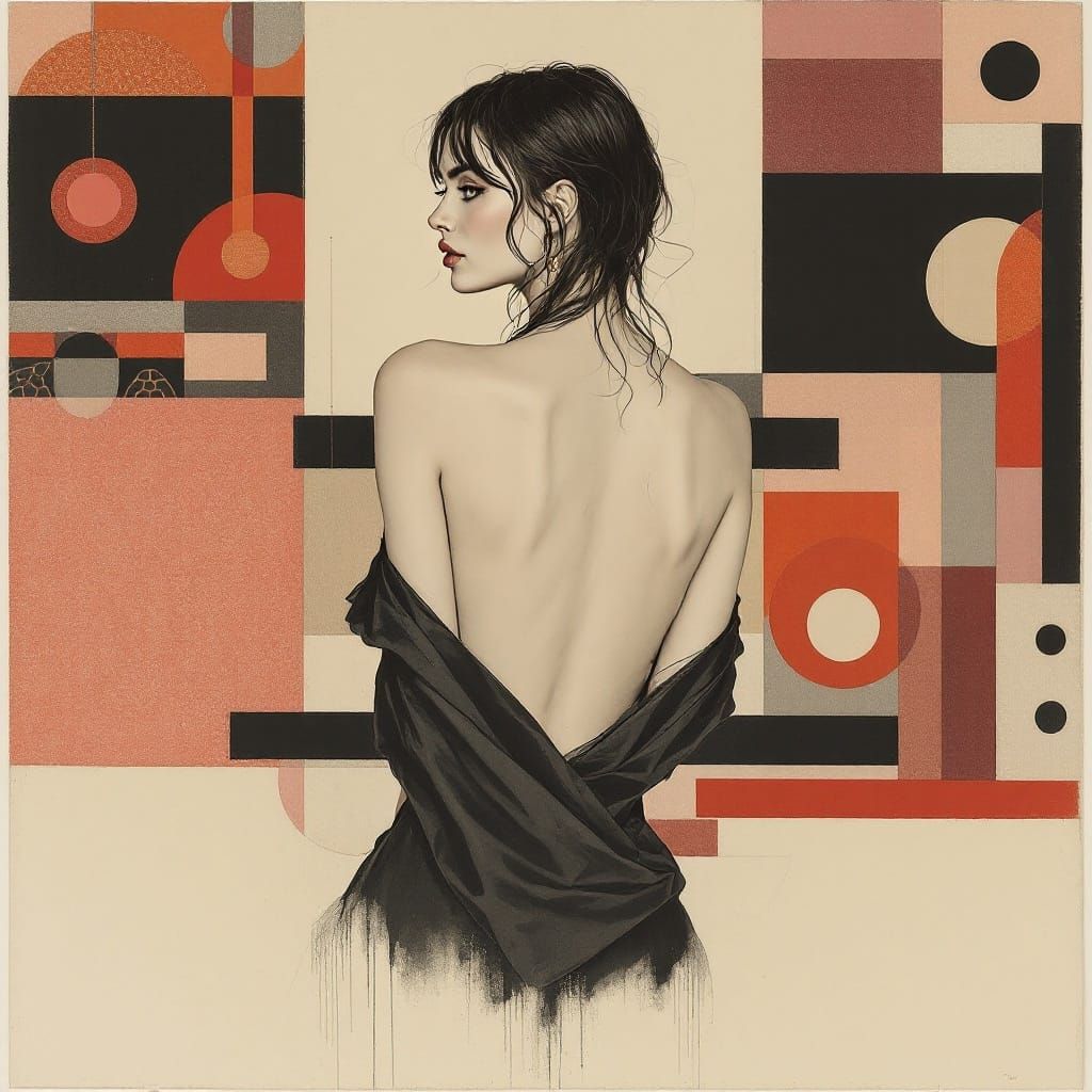 This image showcases a seated woman from behind, surrounded by intricate geometric patterns and abstracted architectural elements, blending portraiture with ornamental abstraction in a unique fusion of styles, featuring a limited color palette and textile-inspired surface patterning.