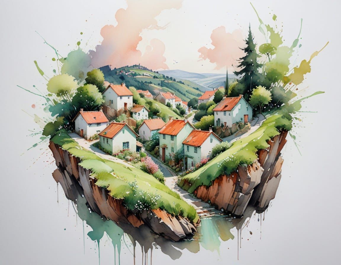 This image depicts a charming village with candy-colored houses nestled in rolling green hills. It features delicate watercolor washes and a serene, artistic aesthetic.