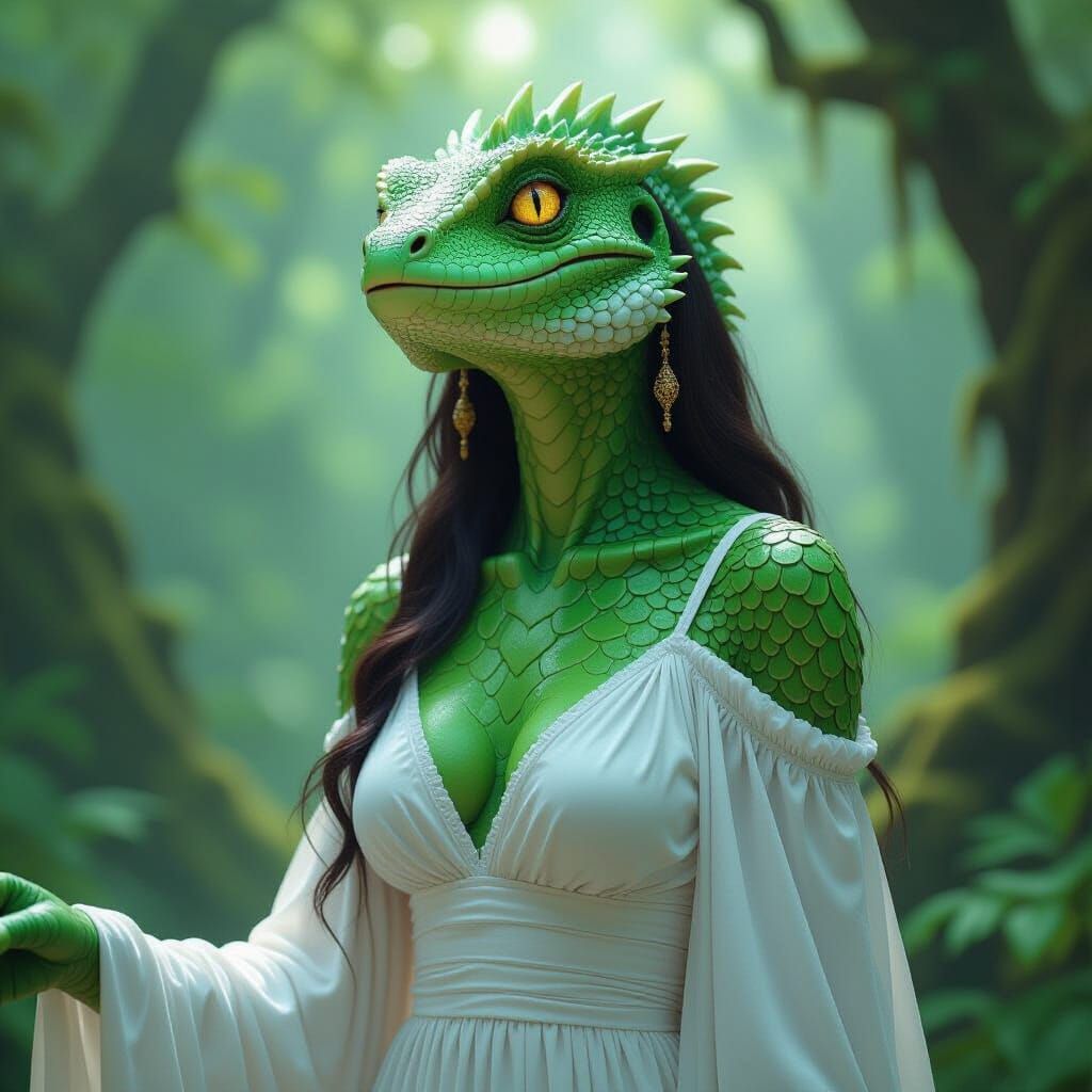 This image shows a striking reptilian woman with green scales and piercing yellow eyes in a mystical forest. The image captures a surreal and realistic scene with vibrant colors.