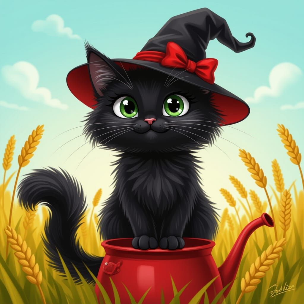 This image shows a cartoonish, semi-realistic witch with purple, black, and red tones, stirring a cauldron. The aesthetic resembles a fluffy comic book character.