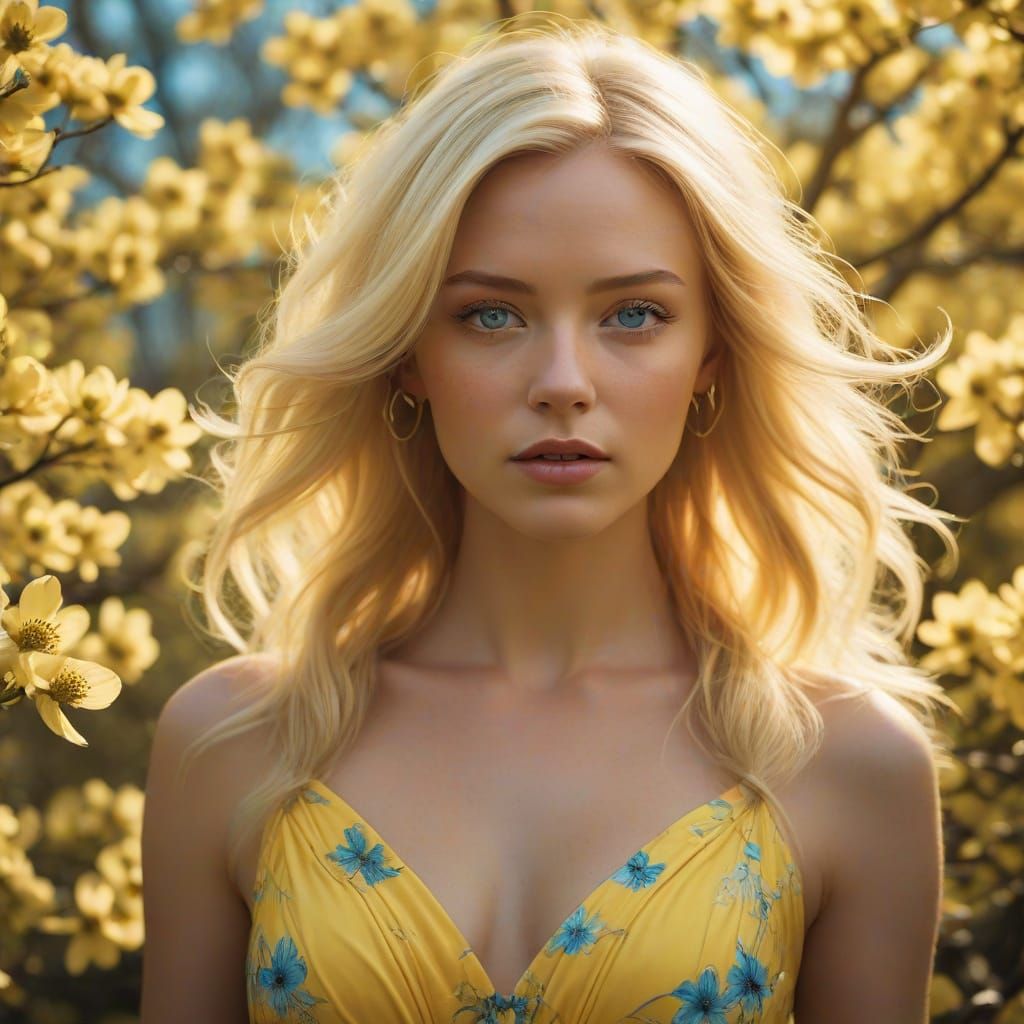 This image shows a Southern Belle in a yellow dress standing in a field of bioluminescent dogwood trees. The scene is hyperrealistic with pop art elements.