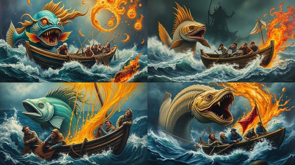 This dramatic painting depicts a fish god from Neptune unleashing a torrent of hot wax rain upon a boat of fishermen, their anguished faces and bodies scorched by the intense heat. Created in a unique blend of hyperrealism and textured impasto, this acrylic masterpiece conveys the agony of those punished...