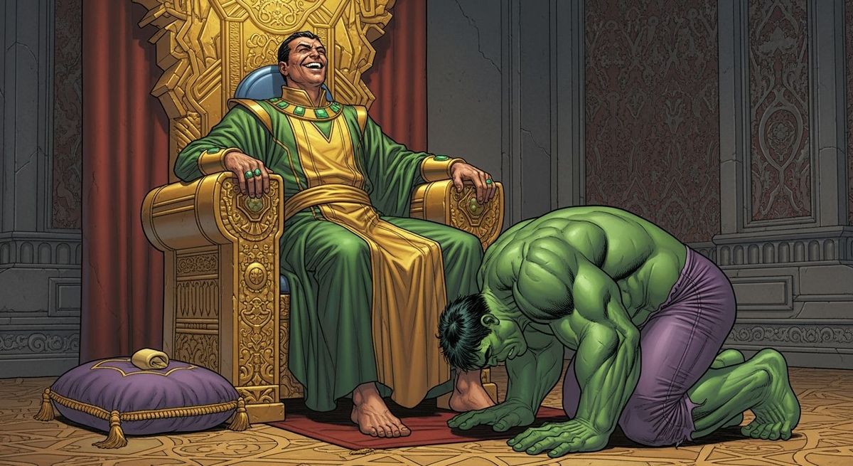 This image shows the Marvel villain Mandarin on his throne, adorned with gold and emeralds. He's dressed in a green and yellow toga, his ten rings visible as he cruelly tramples a defeated Hulk in hyperrealistic comic book style.