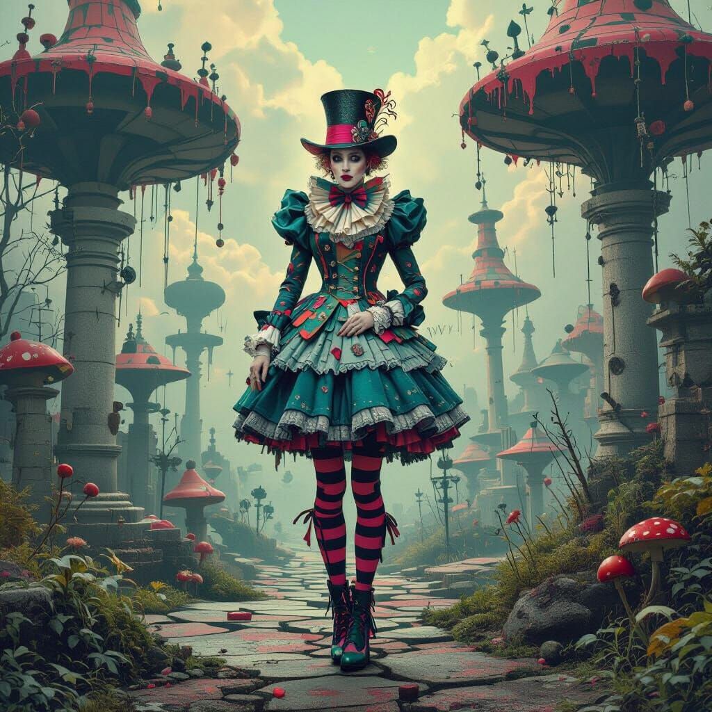 A striking picture of an elegantly dressed female mad hatter in a dreamlike brutalist landscape. The image blends surrealism and storybook illustration with digital art elements, using vibrant triadic colors.