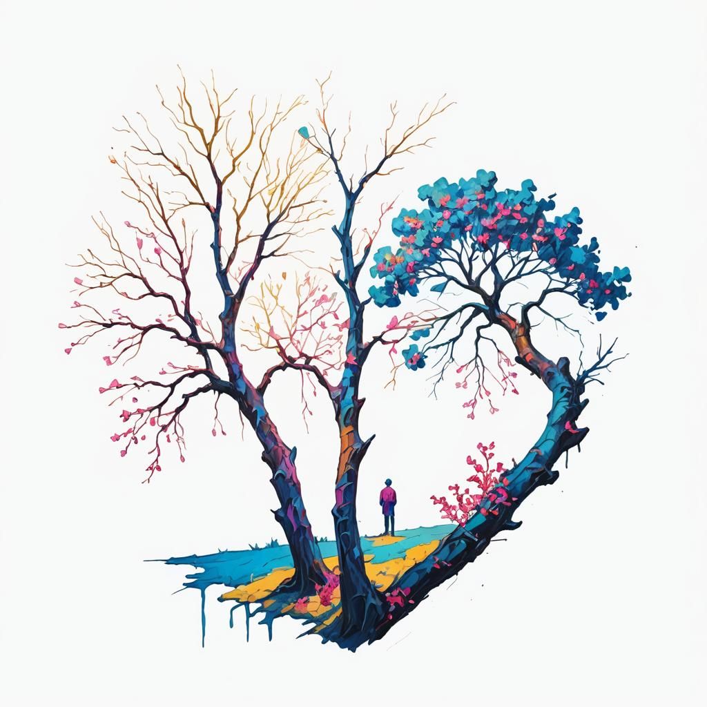 A striking picture of a figure between a barren tree and one blooming with pink bows. This Fauvist oil painting features intense colors, expressive brushstrokes, and soft golden lighting.