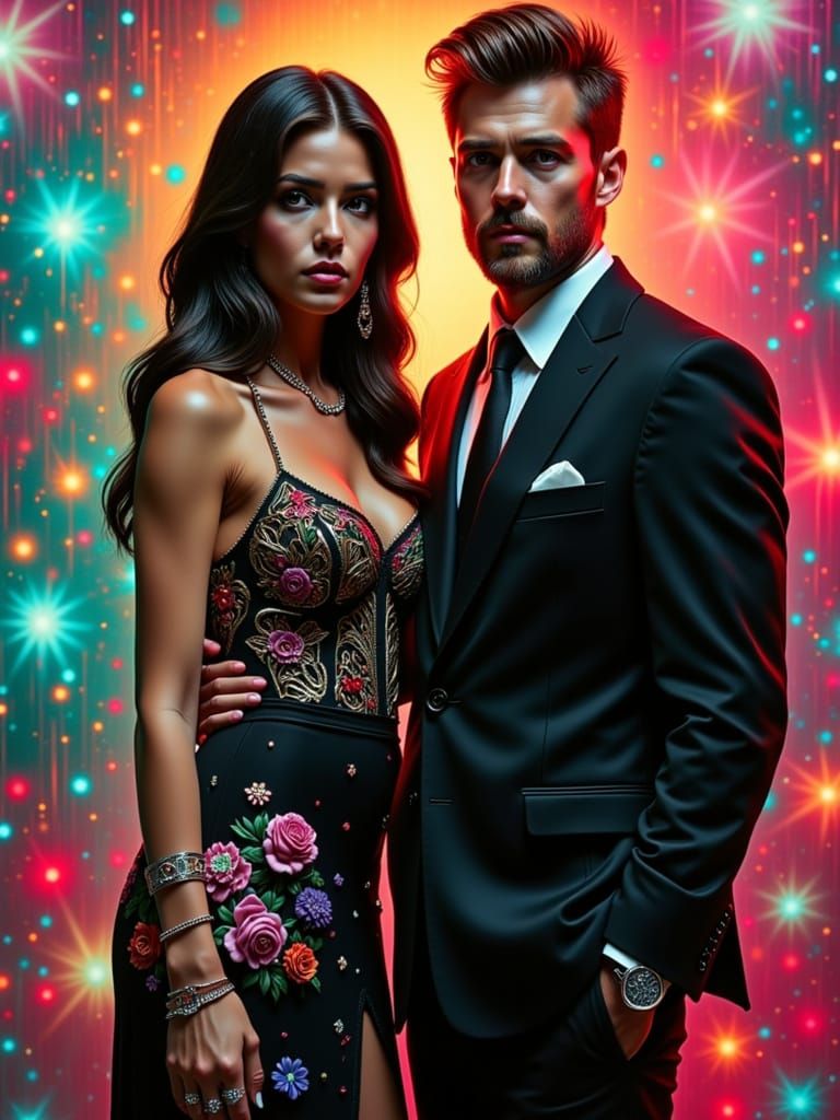 This image shows a very short woman in a dress and a very tall man in a suit standing next to each other. The image is hyperrealistic with vibrant colors, detailed textures, and dramatic lighting.