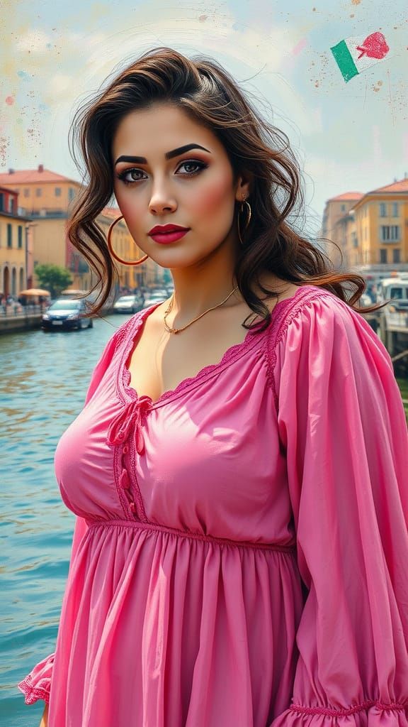 A vibrant oil painting of a Palestinian woman in a pink bohemian dress by a river. The image blends graffiti textures with Persian artistic elements in a polychromatic style.