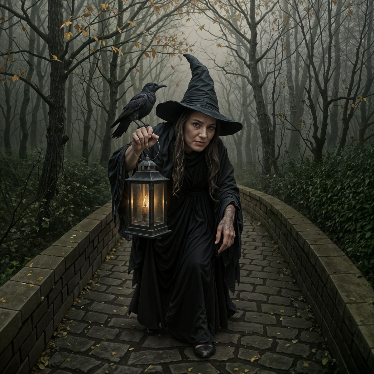 This image shows an old witch walking a cobblestone path in a misty forest. She wears a tattered robe and carries a glowing lantern, with a raven perched on her shoulder, creating a haunting and enchanting scene.