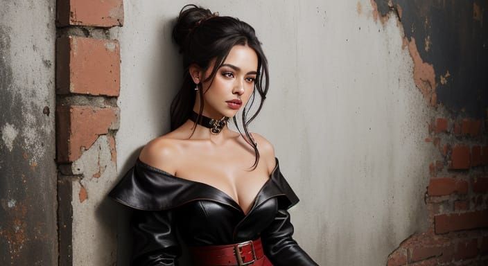 This image shows a woman in a red leather gown sitting on a rock. The portrait features dark and mysterious tones with a textured background, created as a gouache oil painting.